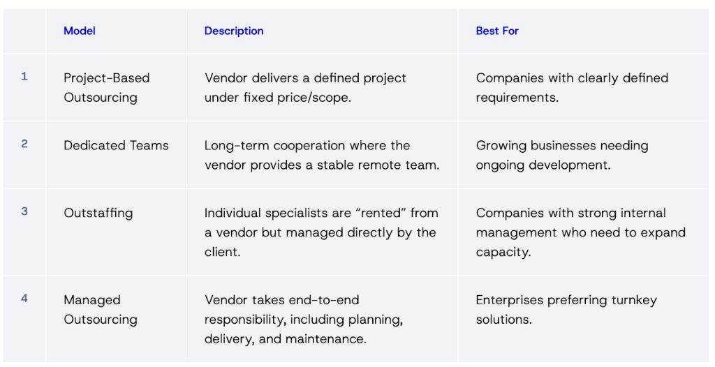 Before diving into costs, it’s crucial to understand the most common outsourcing engagement models: